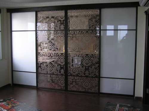 В декоративном отношении здесь множество вариантов оформления. Основа зеркальной двери-купе выполняется из алюминиевого профиля, МДФ и так далее (см. выше). Само зеркало изготавливается как с гладкой, так и с матовой поверхностью, может содержать рисунок (пескоструйный, гравированный и проч.).