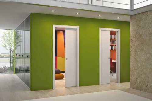 Подобная система является частью стены. Полотно при открывании уходит в металлическую кассету, вмонтированную в стену (как в лифте). Если дверь двустворчатая, ниши устраивают по обе стороны проема.