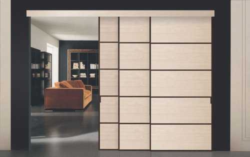 Принцип открытия-закрытия дверей схож с движением штор вдоль окна. Полотно навешивается на потолок или стену над дверным проемом. Скольжение двери происходит с помощью рельсового механизма. Вся эта система закрывается декоративным коробом, который становится важным элементом планировки комнаты.