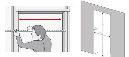 - От центра проема (он обязательно должен быть больше дверного полотна на 10 см) откладываем предварительно вычисленное расстояние: 1/2 ширины двери плюс 1,2 см в сторону ее сдвига и 1/2 ширины конструкции плюс 2,2 см в противоположную сторону. Например, если дверь 70 см (проем 80 см) открывается влево, мы от центра делаем отметку на расстоянии 36,2 в левую сторону и 37,2 см в правую. Эти отметки показывают, где будут заканчиваться металлические профили для гипсокартонной конструкции.