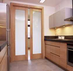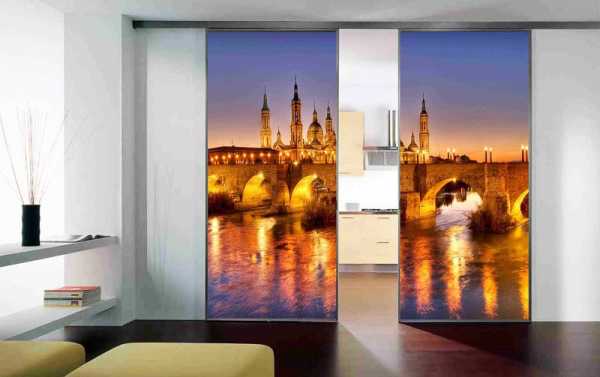Межкомнатные купейные двери (как на фото) бывают подвесные, кассетные, навесные. Кассетные убираются в специальную стенную нишу. С точки зрения экономии пространства это лучший вариант: к такой стене можно ставить мебель, в то время как в других конструкциях к стенке, по которой движется полотно, уже ничего не поставишь.