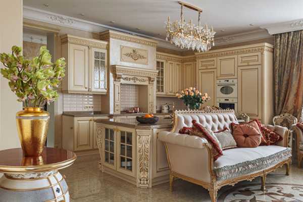 Гарнитур украшают декорированными вставками, резьбой, дорогой фурнитурой. Допускаются также вставки стеклянных фасадов. Цвет выбирают благородный, такой как коричневый, белый, кремовый, сливовый.