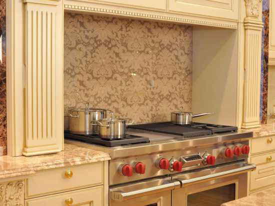 Эта поверхность в классике чаще всего выполняется из керамической плитки. Актуальной тенденцией стала отделка стен кафелем в виде кирпича. Но современные интерпретации стиля допускают и стеклянные решения. Ремонт таковых выполнить проще, как и монтаж, поэтому стекло приходит на смену керамике, как МДФ – массиву.