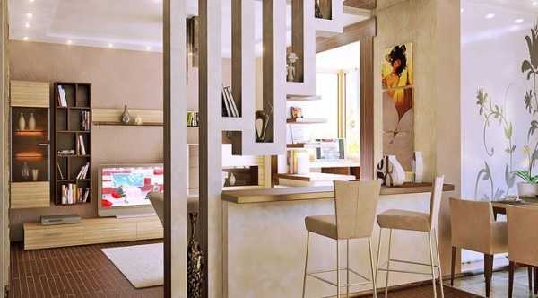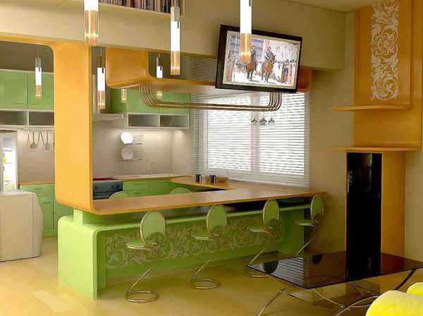 Зонировать помещение можно и с помощью мебели. Так, прекрасным решением станет установка барной стойки на границе кухни и гостиной, к тому же такая стойка может использоваться в качестве обеденного стола, что дает возможность сэкономить необходимое для кулинарного творчества пространства.