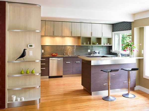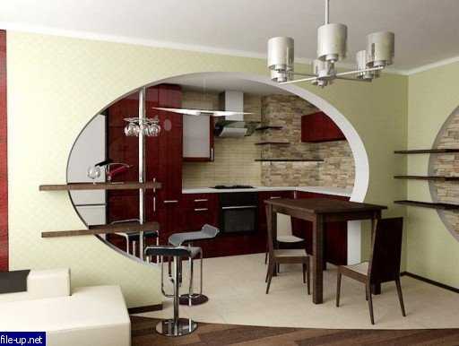 Также для отделения зоны кухни от гостиной или спальни используются мебельные перегородки. Такие конструкции выполняют не только декоративную функцию, но и служат в качестве книжных шкафов, где вы сможете разместить любимые бестселлеры, милые сердцу безделушки, рамки с фотографиями, сувенирами с отдыха и пр. Такое решение подойдет тем, кто хочет хотя бы частично изолировать кухню от жилого помещения. Для этих целей можно также использовать гипсокартон или раздвижные системы.