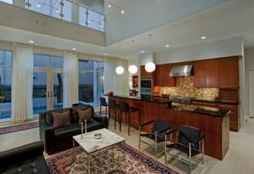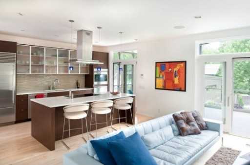 - Пространство кухни и комнаты должно гармонировать друг с другом, резким переходом между зонами подобного не добиться. Поэкспериментируйте с контрастной отделкой, перепадами между уровнями пола или установите барную стойку на границе комнат.