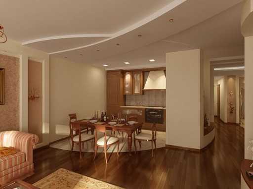 Отделить гостиную от зоны кухни и столовой можно за счет разного уровня пола: кухонный гарнитур и обеденную группу размещаем на подиуме, возвышающемся над основным уровнем пола. Весьма декоративно в сочетании с подиумом смотрятся ступеньки, металлические и кованые перила, встроенные в подиум точечные светильники. В подиуме также можно спрятать систему теплого пола, трубы и прочие коммуникации. Разноуровневым может быть не только пол, но и потолок: навесные, натяжные потолки, потолочные конструкции из гипсокартона.