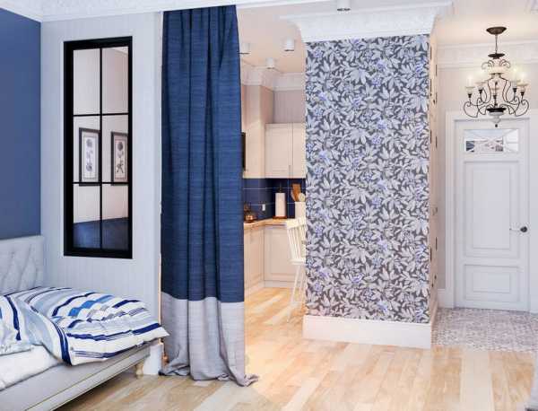 Менее практичным является зонирование с помощью занавесок или текстильных ширм. Такой прием актуален для изоляции спальни, а вот для отгораживания кухни мало подходит, так как ткань очень хорошо впитывает запахи от приготовления пищи.