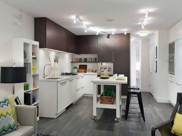 При решении вопроса освещения квартиры-студии, и кухни в том числе, следует помнить, что визуально увеличить помещение поможет рассеянный мягкий свет, в то время как резкий полумрак и тени сделают вашу квартиру еще меньше.