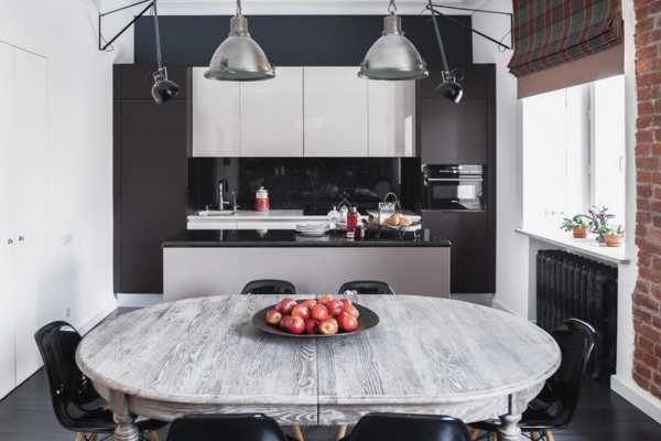Бесспорный минус кухни-студии – сильные ароматы и запахи, которые не всегда неприятны, но часто просто неуместны. Если вы любите готовить и посвящаете кулинарному творчеству много времени, не забудьте установить мощную, но максимально малошумную вытяжку. Учтите, она должна выводить воздух на улицу, а не фильтровать и возвращать в комнату. Доплатив за стильный дизайн и декор вытяжки, вам не придется прятать ее за фасадами кухонного гарнитура.