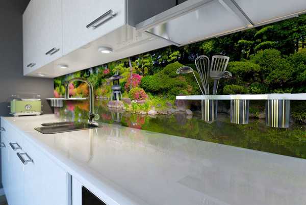 - Но, конечно, самые красивые стеновые панели – с нанесенной фотопечатью. Здесь изображения наносят на внутреннюю сторону стекла на специальном принтере с использованием УФ-отверждаемых чернил. Такое изображение практически вечно, как утверждают отзывы, поэтому повредить его можно только вместе со стеклом.