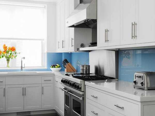 Цветной стеклянный фартук, защищающий окрашенные стены кухни