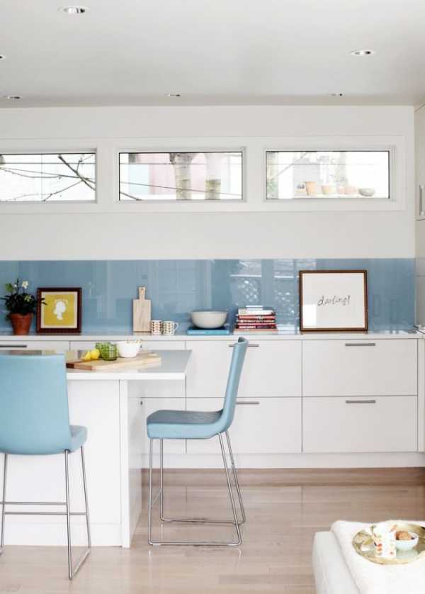 Свежий голубой цвет стеклянной вставки на кухне без верхних шкафов
