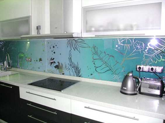 При желании под стеклом можно разместить любые инсталляции, способные оживить интерьер вашей кухни или, с помощью пескоструйки, нанести надписи, которые украшают кафе и рестораны. По желанию панели можно просто сделать матовыми.