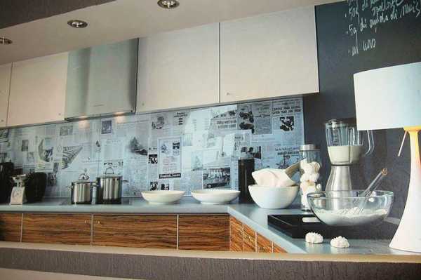 - Оклейка обоями рабочей стенки и защита их стеклянными панелями. Это самое бюджетное решение.