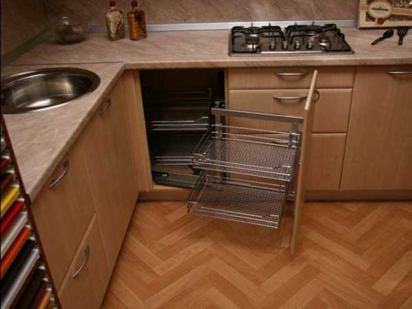 Чем то занять это место можно различными способами. Например оставить его под мойку. Если она не предназначена для угла, то расположите мойку немного в сторону. Чаще всего над ней крепят сушилку для посуды, кто – то ее так и ставит, а кто — то помещает в закрытый шкафчик.