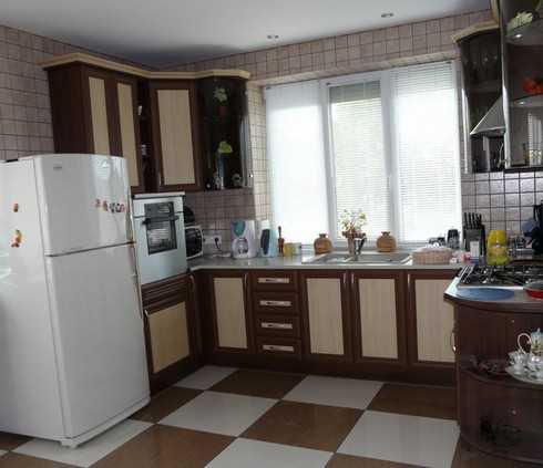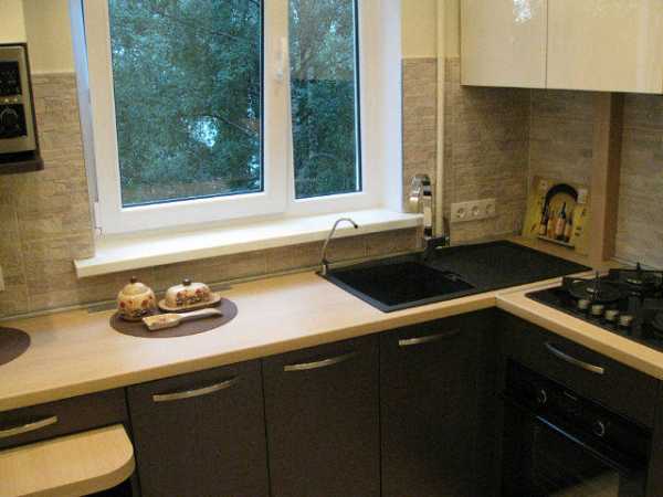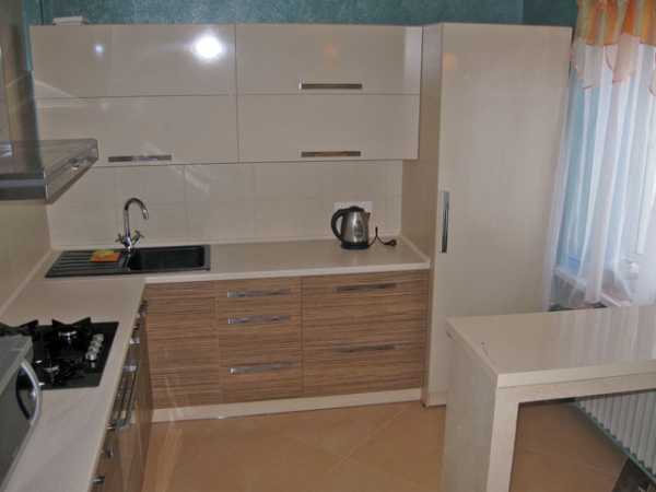 В угловом варианте можно поворот гарнитуры сделать под окном, при этом расширив подоконник. При наличии там радиатора, откидной стол – выход из положения, где закроется красивой панелью батарея. Угловая кухня с холодильником очень практична.
