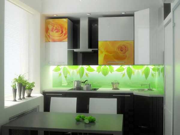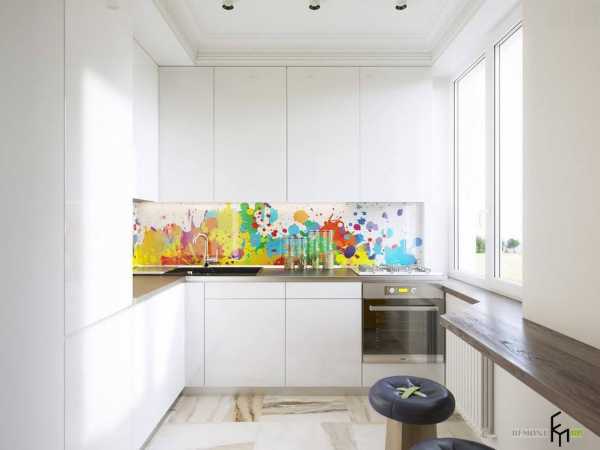 Самый простой, но при этом и самый эффективный способ оформления маленькой кухни – применение белого цвета кухонного гарнитура и отделки в сочетание с небольшими яркими вкраплениями. Яркими акцентами на белоснежном фоне может стать как оформление кухонного фартука, так и бытовая техника необычных тонов или просто колоритная посуда, выставленная на всеобщее обозрение.