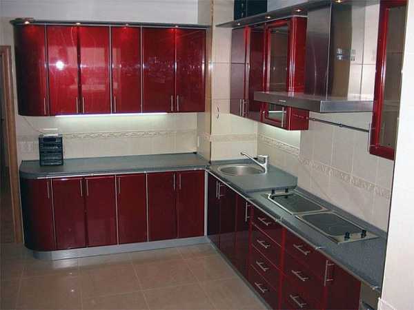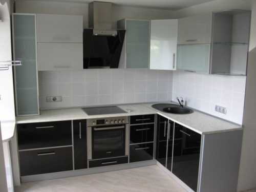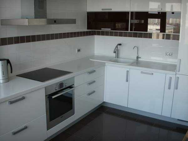 Рекомендуем выбирать глянцевые фасады светлых тонов со столешницами. Угловые кухни для маленьких кухонь стоит предпочесть из наполовину прозрачных материалов, за счет чего визуально можно увеличить комнату. Нелишним будет дополнительное освещение в такой комнате.