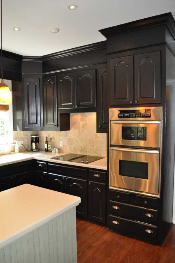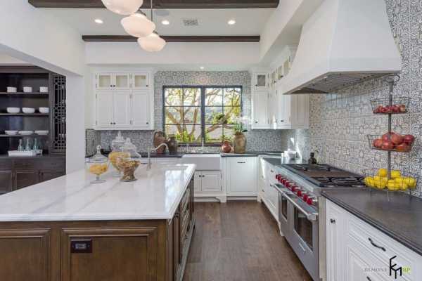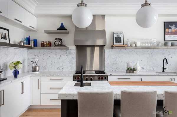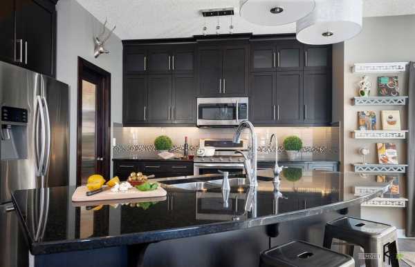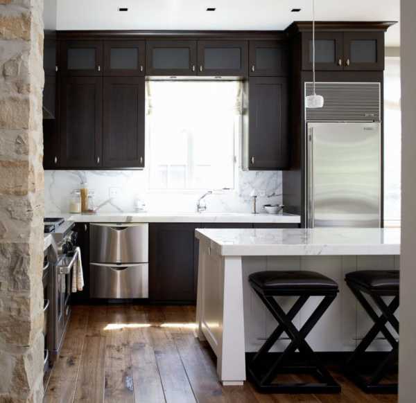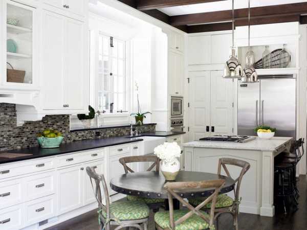 Черный и белый, это вневременной, классический цвет. У этой кухни двери черного острова выглядят немного более современными, кафель на фартуке темного цвета, но в основе все равно лежит классический стиль.Фото кухонь в стиле классика