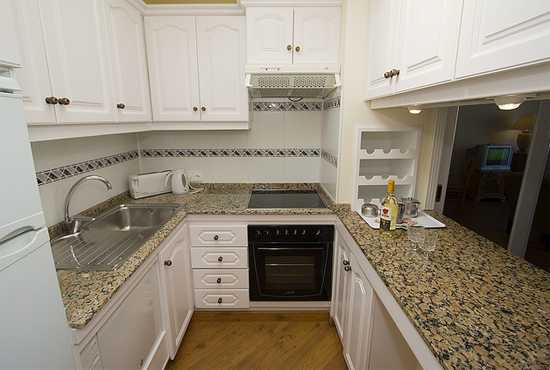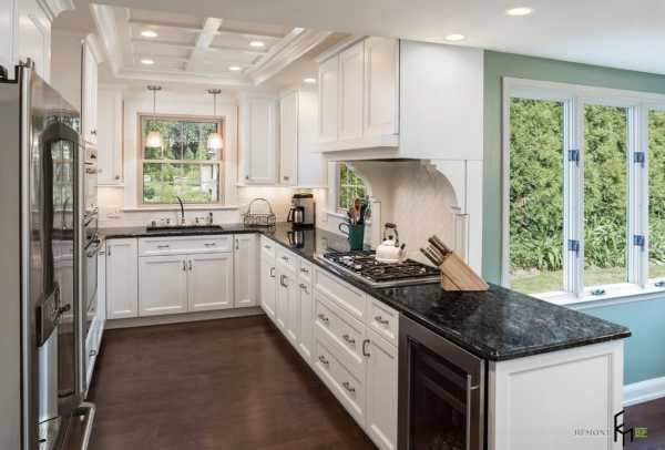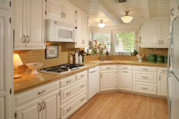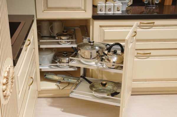 Классические кухонные шкафы в светлой цветовой палитре, окантованные столешницами из темного камня – отличный вариант для небольшой кухни. Каждый квадратный сантиметр использован рационально и эргономично. В частности угловые шкафы дает возможность использования достаточно большого количества мест хранения, дверцы на таких ящиках складываются как гармошка или вместе с дверцей выдвигаются полочка для хранения посуды, крышек, банок со специями или бутылок.