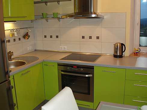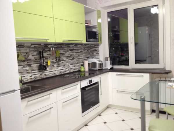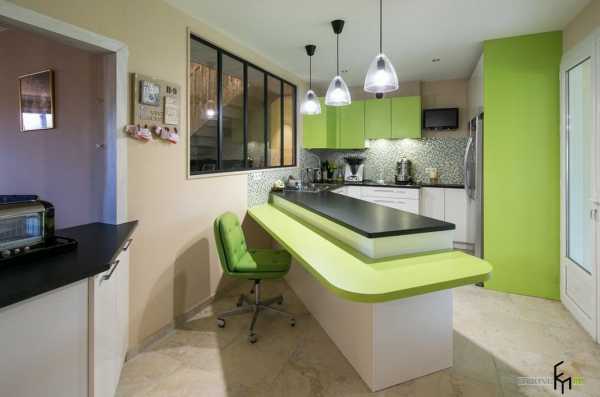 Почему бы не добавить яркости в небольшое помещение кухни? Сочетание белого, черного и цвета молодой травы в этой кухне, производит сильное, запоминающееся впечатление. А оригинальное исполнение кухонной стойки завершает необычный образ.