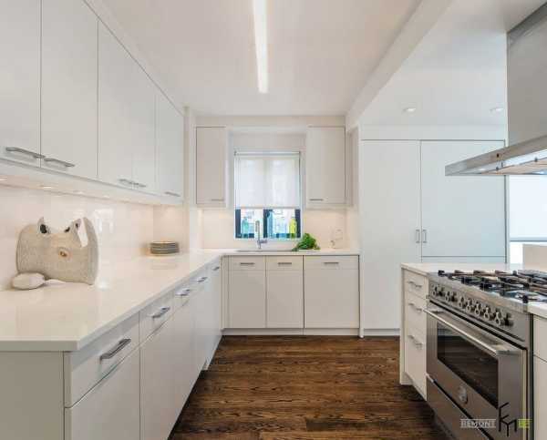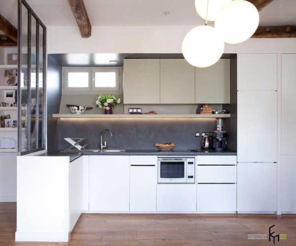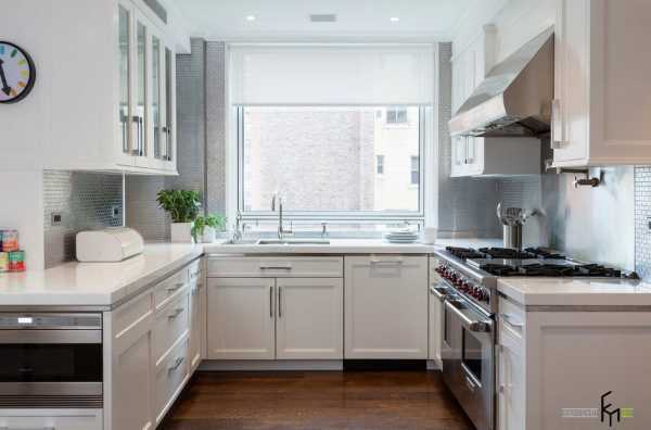 Даже небольшое пространство вашего жилища можно рационально обустроить под рабочую зону кухонного помещения. Угловое расположение нижнего яруса кухонных шкафов и навесные системы хранения, которые размещены везде, где это только возможно – составили вместительную и эргономичную кампанию. Светлая отделка пространства и выбор белого оттенка для кухонной меблировки, безусловно, сыграли не последнюю роль в вопросах зрительного расширения пространства.