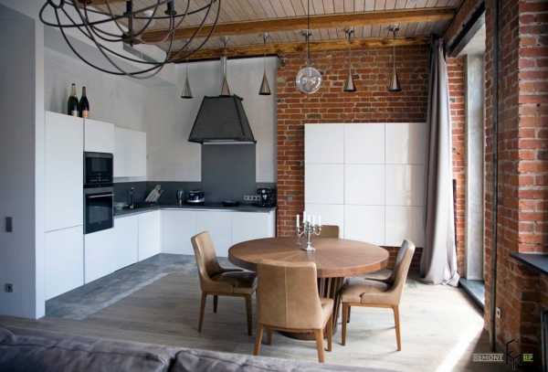 Минимализм в кухонном гарнитуре отлично подходит для помещений в стиле лофт. Глянцевые поверхности строгих систем хранения прекрасно выглядят на фоне кирпичной кладки.