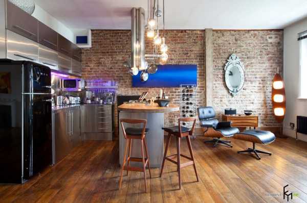 Сложно не заметить угловой кухонный гарнитур с поверхностями из нержавеющей стали, ультрамариновой подсветкой, глянцевым черным холодильником и все это на фоне эклектичного интерьера кухни-гостиной, которая органично совместила элементы модерна и стиля лофт. Обилие блестящих, зеркальных и глянцевых поверхностей на фоне брутальной отделки из древесины и кирпича производит ошеломляющий эффект.