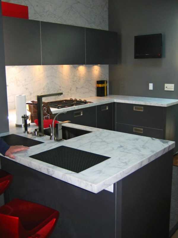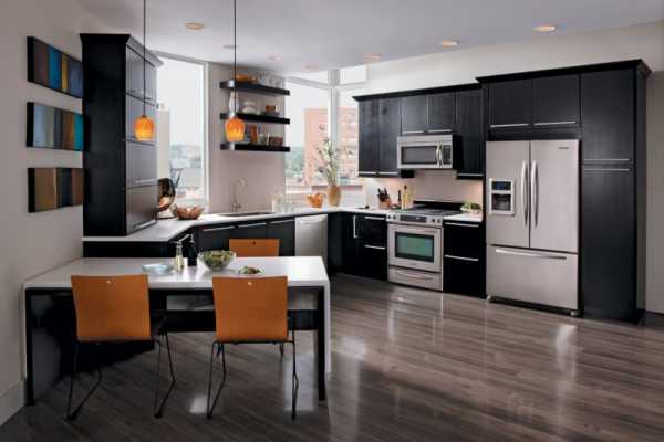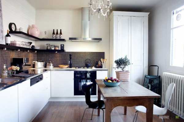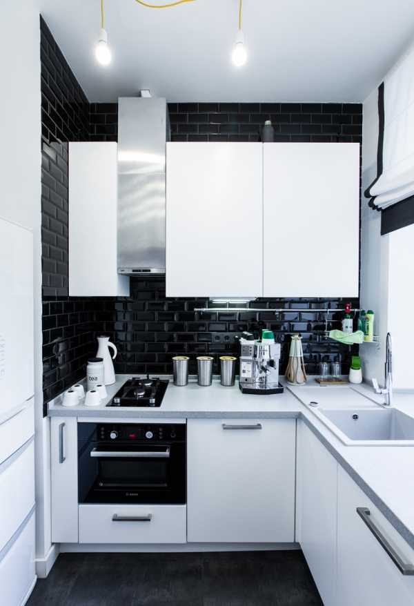 Маленькая кухня – это не всегда светлая палитра отделки и белоснежные системы хранения. Контрастные цветовые решения могут смотреться не менее выигрышно и презентативно. Черные столешницы и бытовая техника на фоне белоснежных кухонных шкафов производят сильное впечатление.