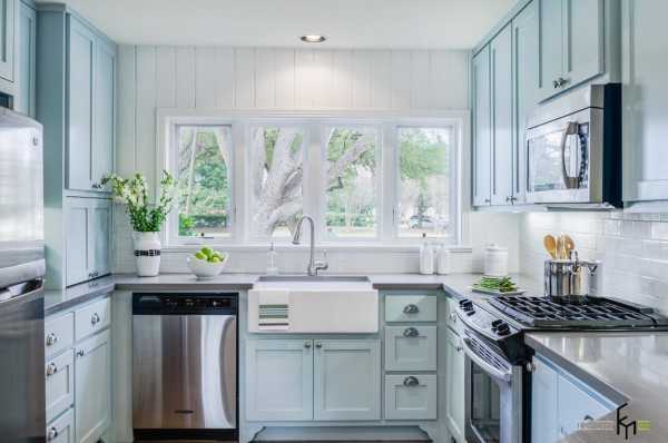 Светлая палитра для кухонных шкафов классического вида, неброская, но оригинальная отделка стен, обилие естественного освещения и скромная по площади кухня выглядит роскошно.