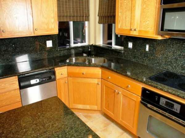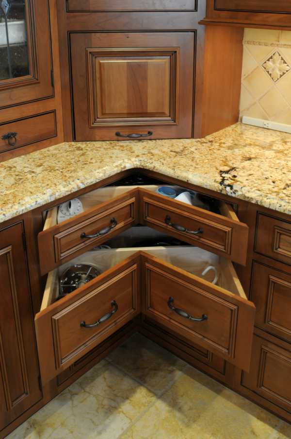 Выбирая какой-то определенный дизайн для угловой кухни в уголу устанавливают рабочую зону. Для этого стол будет иметь соответственную форму. Можно туда разместить две тумбочки, только не забудьте, чтобы они открывались в разные стороны.
