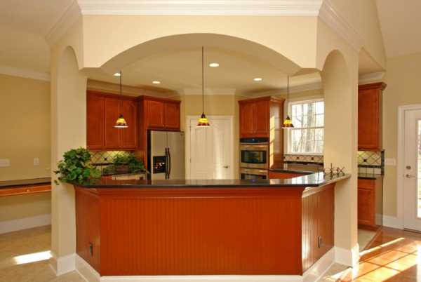 Функциональность позволит разместить необходимую мебель ближе к центру кухни. По правилу «золотого треугольника», его углы: плита-раковина-холодильник — это наиболее удобный для хозяйки вариант.