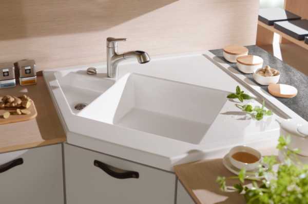 * чаще всего мойка устанавливается в угловой тумбе, поэтому общий дизайн помещения никак не нарушается данным необходимым элементом