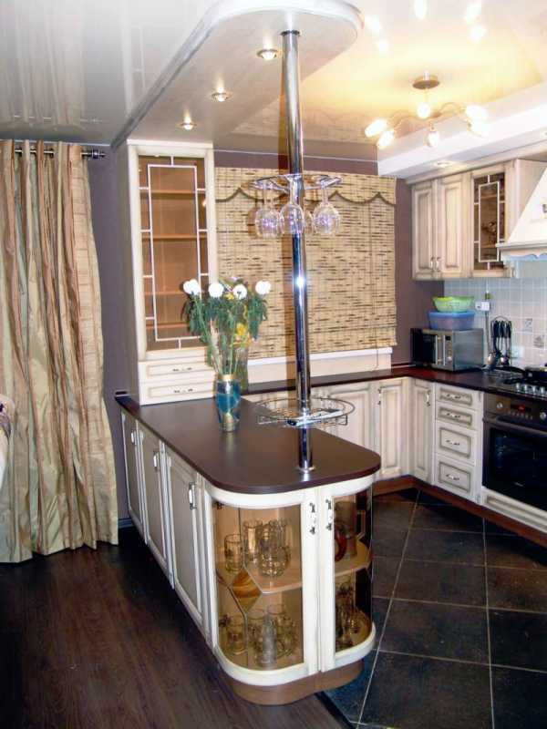 - Стильное дополнение к дизайну угловой кухни. Сверху можно предусмотреть держатели для разных бокалов, установить удобные тумбы в основании барной стойки, где поместится даже маленький холодильник.