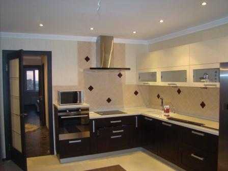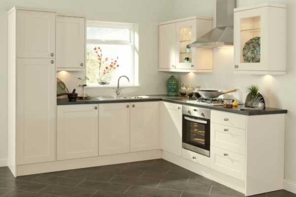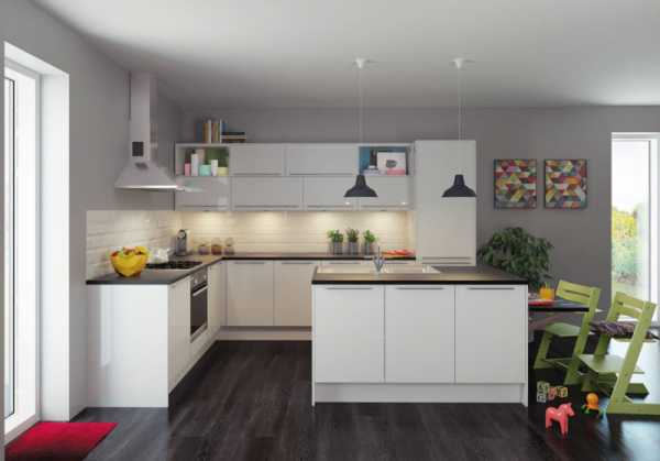Плита, мойка и рабочая поверхность угловой кухни располагаются удобно и безопасно. Рабочая поверхность между плитой и мойкой защитит первую от попадания брызг. Г — образная расстановка мебели оставляет место для компактного размещения обеденного стола. Полностью занимая угол, угловая кухня оптимальна для помещений, где не очень удобно расположены окно или дверь.