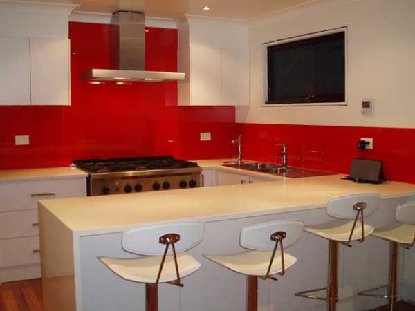 Красный, синий, зеленый и желтый цвета отлично смотрятся для угловой кухни, выполненной в стиле модерн.