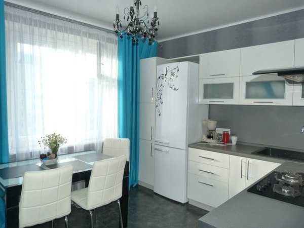 Если в такой кухне имеется еще и балкон, можно совместить его с кухней. Отлично будет на нем организовать зону приема трапез, а мебель в кухне расставить Г-образно.