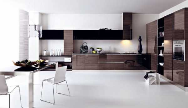 Если вам по духу контрастные сочетания, природные оттенки, плавность линий и форм, обилие блестящих, зеркальных и стеклянных поверхностей, некоторая смелость в оформлении пространства, то следующая подборка кухонных интерьеров в стиле модерн может оказать вдохновляющий эффект.