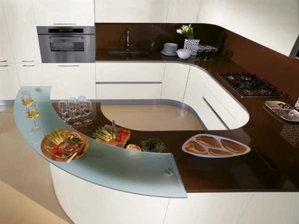 Среди людей, у кого имеются средние по размеру кухонные комнаты, довольно популярны варианты встроенных столешниц, по виду напоминающих барные стойки. Также угловые столешницы можно устанавливать в районе окна.