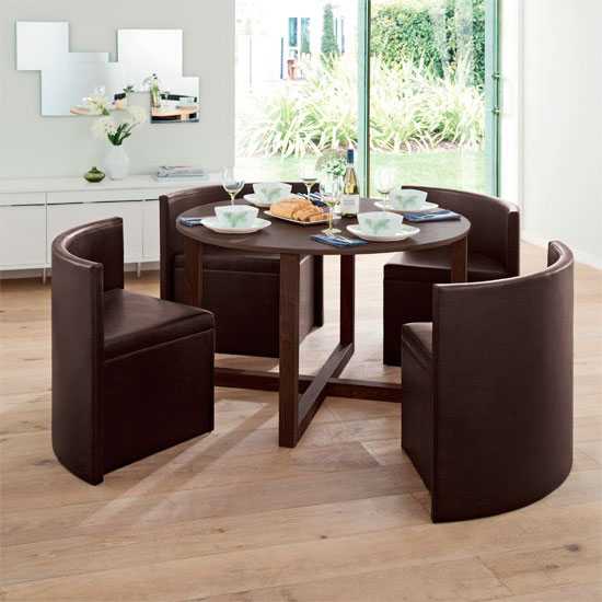 Наиболее компактный вариант – это маленький стол квадратной формы: для ежедневных обедов семьи из 4 человек хватит квадрата размерами 90 х 90 см.
