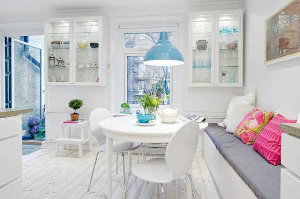 Однако аккуратные круглые и овальные столы точно также займут минимум места, если поставить их вплотную к окну, к стене или в угол. Благодаря округлой форме за ними сможет комфортно сидеть больше людей, чем за прямоугольным или квадратным столом. Кроме того, отсутствие острых углов на маленькой кухне убережет от случайных травм не только непоседливых детей, но и вечно спешащих взрослых.