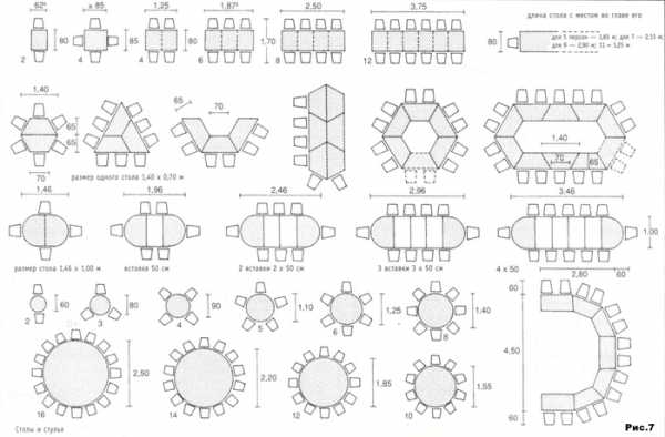 Существует соотношение размеров столешниц и вместимости обеденных столов. Так, модель размером 150 х 90 см вместит 4-6 человек, 200 х 110 см – до 8 человек, 260 х 110 см – до 10 человек.