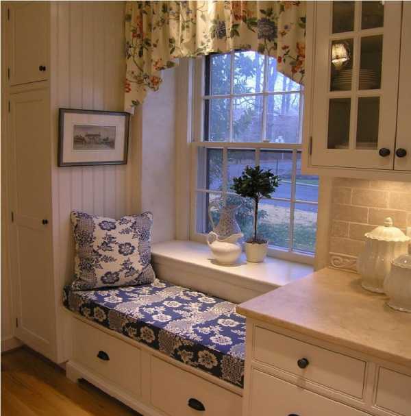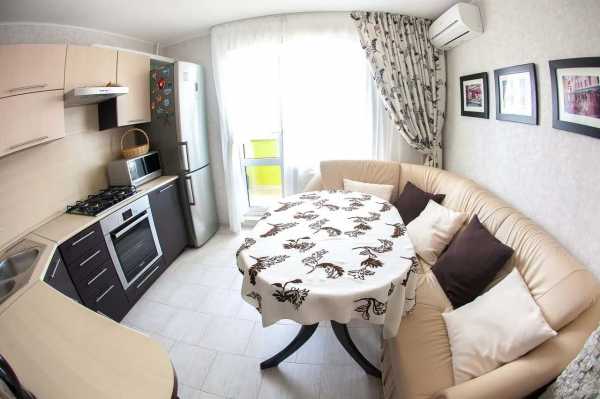 - Расширение кухонной зоны благодаря объединению комнаты с балконом, или кладовой. Функциональность достигается за счет отделения рабочей зоны от обеденного уголка, где устанавливается компактный диван с нишей для хранения кухонных принадлежностей. Сложность дизайнерской идеи компенсируется удобством помещения.