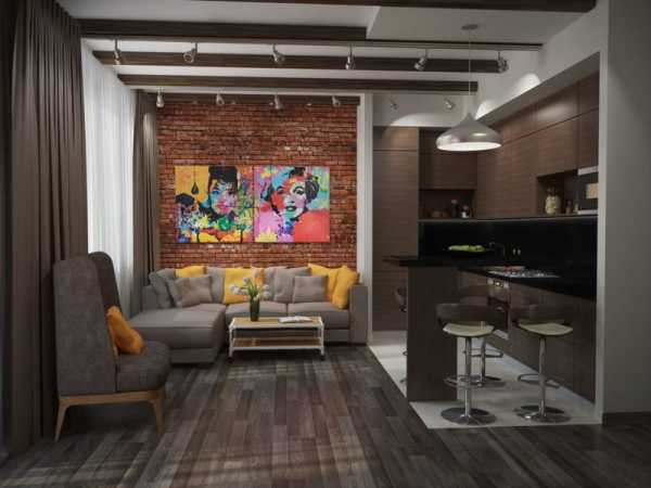- Деление помещения на отдельные зоны с помощью мебели, освещения, отделочных материалов. В таких интерьерах гостиная комната часто является продолжением кухни.