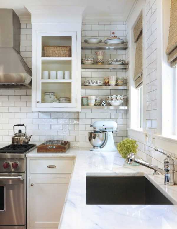 - Создать чувство свободы. Вместо навесных шкафов с дверцами лучше расположить открытые навесные полки. Для экономии пространства, вместо плиты можно установить варочную поверхность.