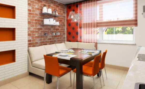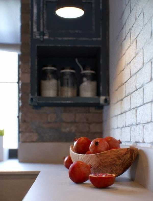 При отделке стен стоит отдать предпочтение кирпичной кладке. Если ремонт проводится в многоэтажном панельном доме, имитацию кирпичных стен можно сделать из декоративной плитки или обоев. Оригинально будет смотреться оформление кухни темным и светлым кирпичом. Возле ниш можно сделать имитацию кладки темным цветом, а на фоне мебели подчеркнуть стены светлым оттенком. Для совсем маленьких пространств, вместе с кирпичным цветом можно задействовать светлые декоративные панели.