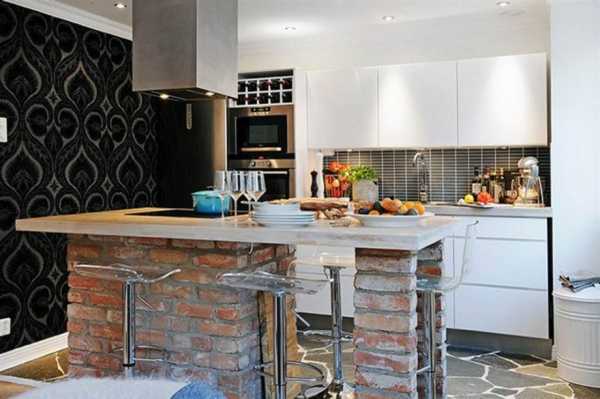 Для небольшой кухни так же идеальным будет вариант с барной стойкой вместо стола. Она будет выступать в роли бара, обеденного стола, места для приготовления пищи, а так же поможет нестандартно разделить пространство Вашей квартиры.