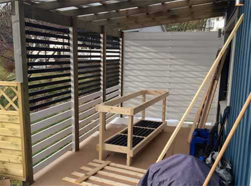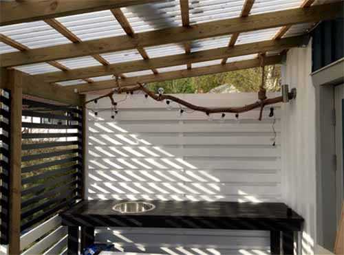 Для того, чтобы создать более защищенное от непогоды место, заднюю часть террасы зашили наглухо, а боковую часть оформили деревянными рейками.