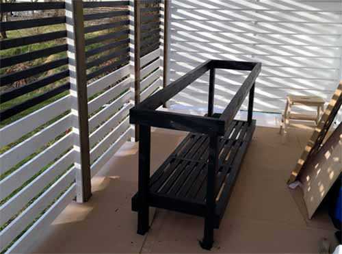 Рабочий стол летней кухни сделан на деревянном каркасе. В нем предусмотрена полка для хранения кухонной утвари. Для надежной защиты от непогоды стол покрашен специальной краской для дерева для наружных работ.